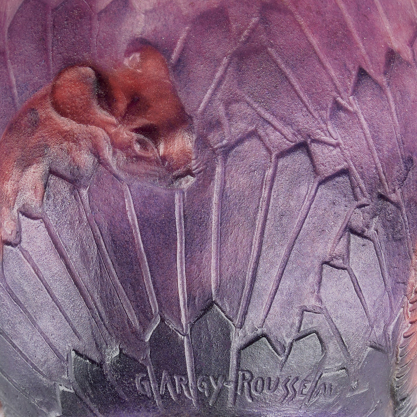 This French "Ecureuils dans l'herbe," or "Squirrels in the grass" pâte de verre vase by Gabriel Argy-Rousseau is exquisitely executed entirely in a palette of warm reds, pinks, and purples, features a soft, innocently postured squirrel climbing through architectural foliage that takes the form of many obelisks arranged in swathes to resemble deconstructed palm fronds.
