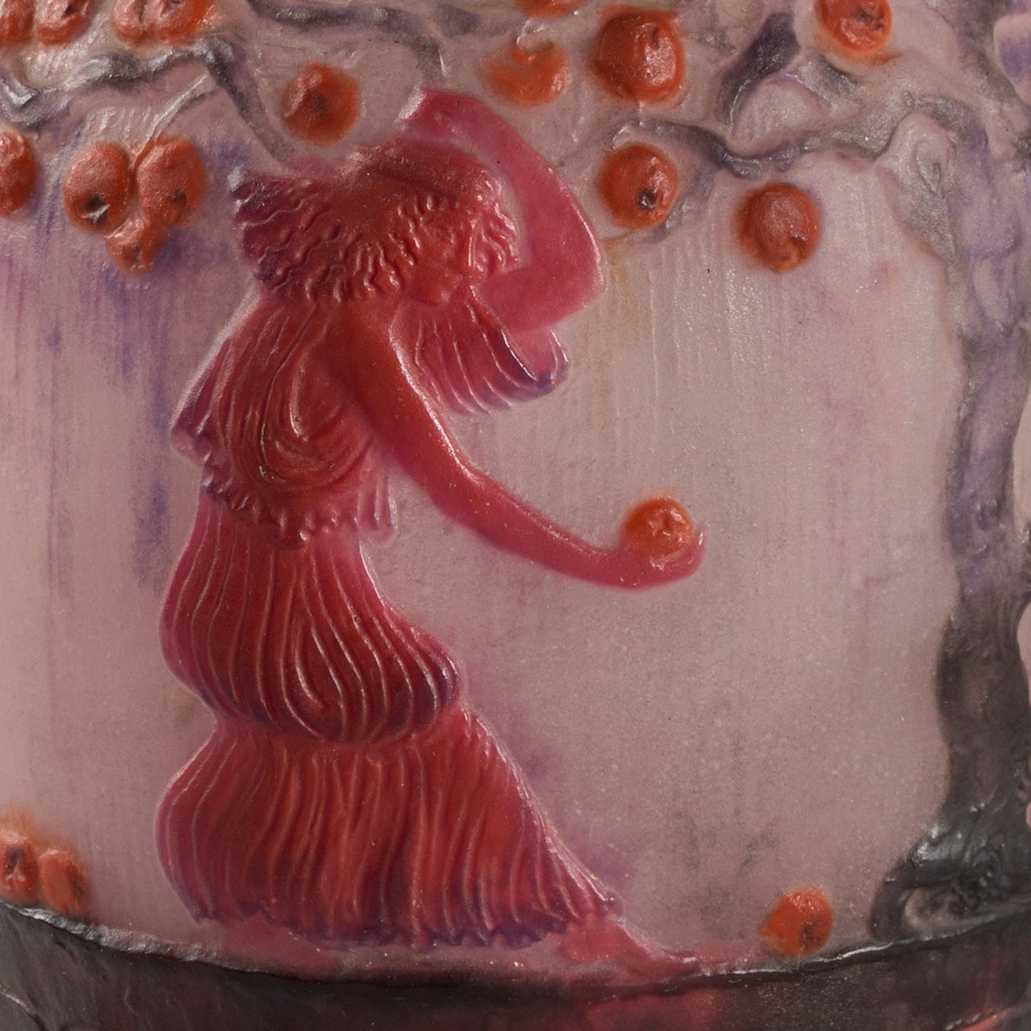 A French Art Nouveau pâte de verre vase, this work by Gabriel Argy-Rousseau is entitled "Le Jardin des Hespérides (Garden of the Hesperides)." The vase depicts a motif of Grecian women animatedly picking the harvest of a lush apple tree. The entire composition is attractively hued, in effusive pinkish-purples and pastel-like reds. The lower portion of the vase is in darker red, resembling a floor, with a Greek key motif.