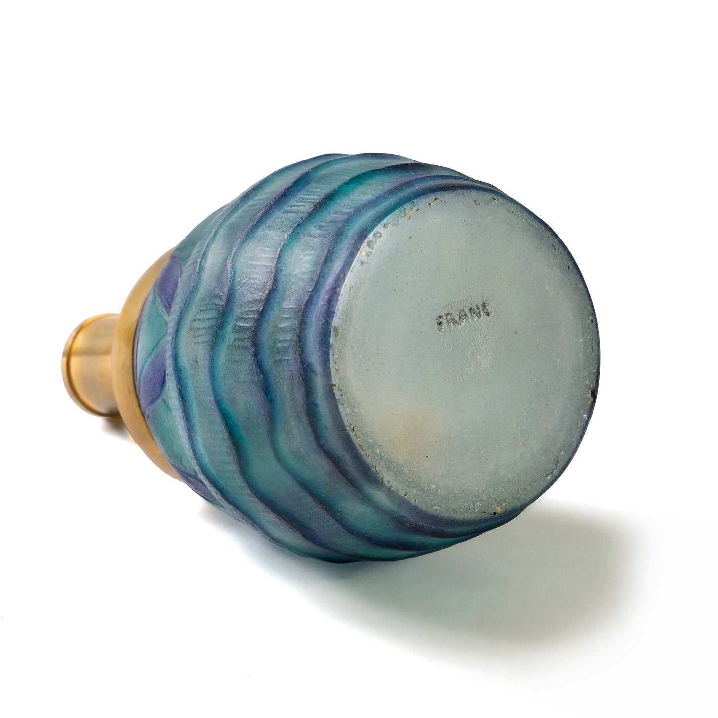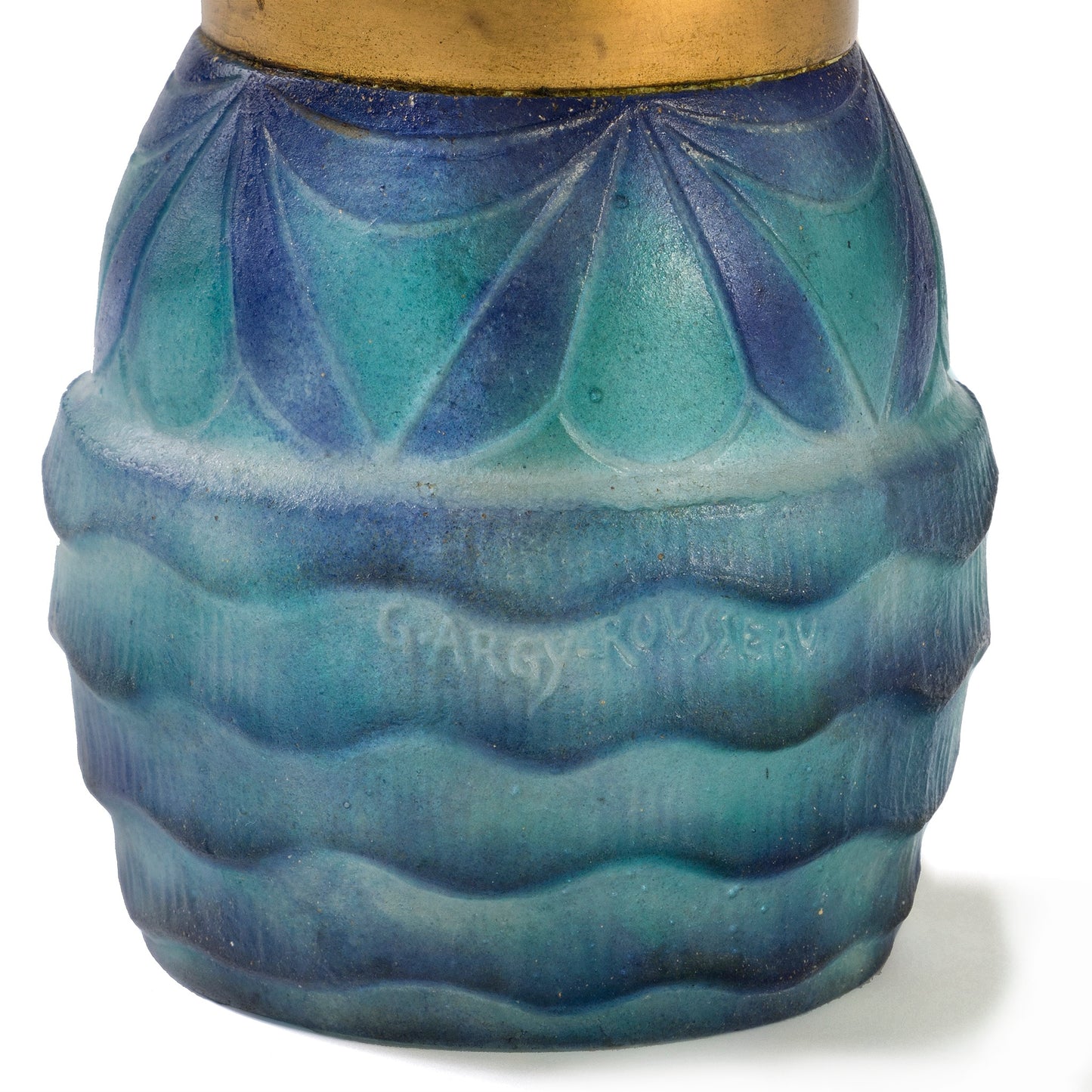 Gabriel Rousseau adopted the suffix 'Argy' in honor of his wife Marianne Argyriadès. She was his best friend's sister. They all shared a love of Greco-Roman and Egyptian antiquity. Argy-Rousseau was interested in many things, studied at the École de Sèvres, but also completed an engineering degree. Throughout his life, he conducted research in areas as diverse as dental porcelain and color photography. In his private life he always surrounded himself with creative personalities, including Henri Cros, who had long been known for his glass works using the 'pâte-de-verre' technique. Argy-Rousseau began to work successfully with the material even before the First World War, after the war he founded a glass factory that had 20 employees at its peak. He developed his own technique for producing his ideas: Argy-Rousseau first modeled his sketched idea in plaster, which was then covered with wax. A refractory hollow mold consisting of several parts was then molded from this model in several work steps. He even produced his own glass. It was crushed into powder and colored by the addition of metal oxides. With the help of fine brushes, the now liquid glass mass, which had been washed several times, was applied precisely to the walls of the refractory mould. Two more layers followed, one after the other, to create strength and at the same time prevent air bubbles from forming. The last layer was resin to further fix the pate de verre. The model was then placed upside down in a wood-fired oven, where the piece was then fired at high temperatures. After cooling, the mold was removed, the now solid object cleaned with acid and the last bumps polished off with a wheel. This is how these wonderful, transparent, at the same time colorful, delicate-looking objects came into being.