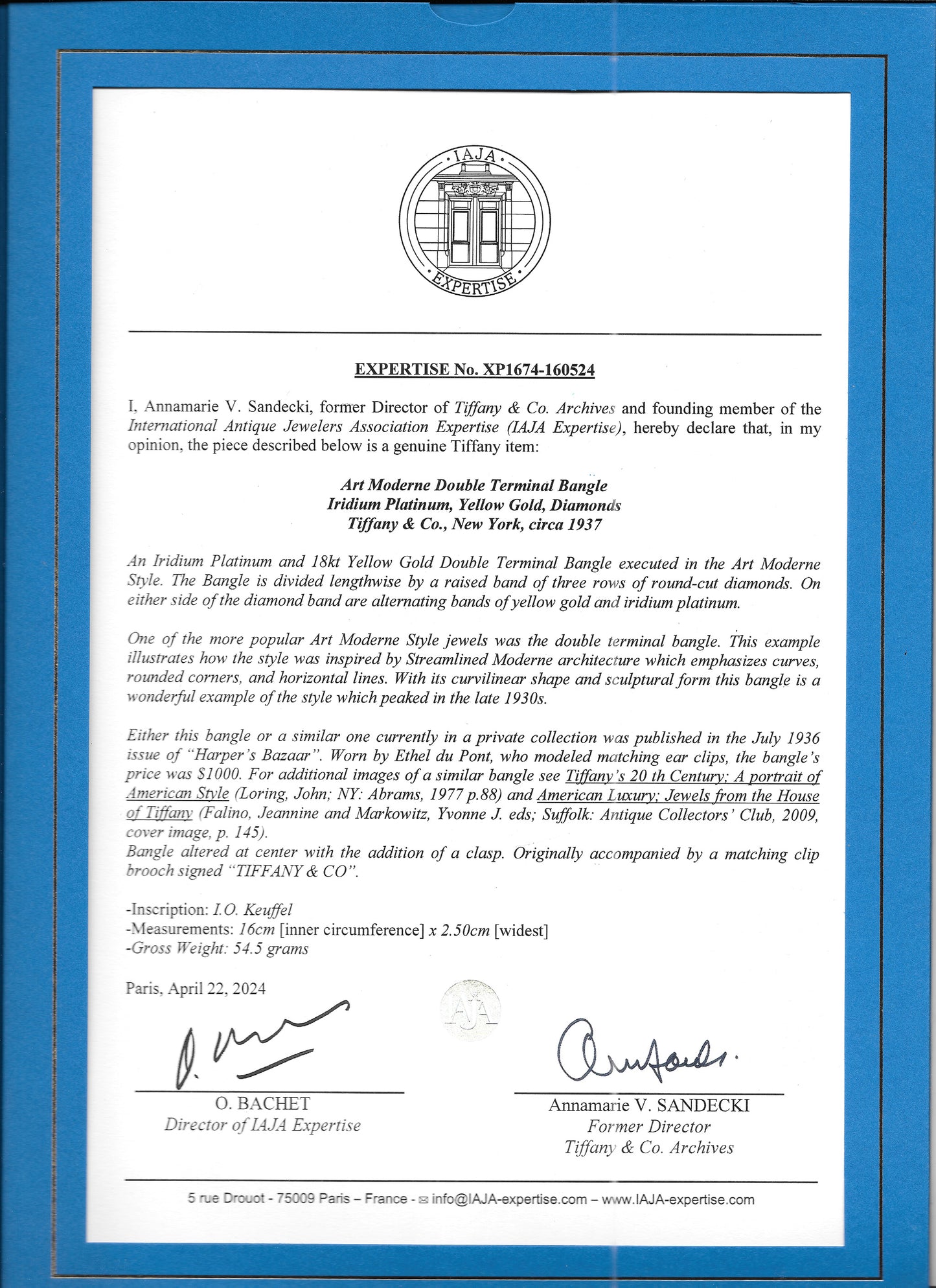 Documentation: Bracelet accompanied by a certificate of expertise no. XP1674-160524 from IAJA provided by former director of the Tiffany & Co. archives, Annamarie Sandecki, stating that the bracelet is a "genuine Tiffany item". The certificate states that this bracelet or one like it was modeled in the July 1936 issues of Harper's Bazaar. It is noted that the bracelet was modified to add a central clasp at the top.