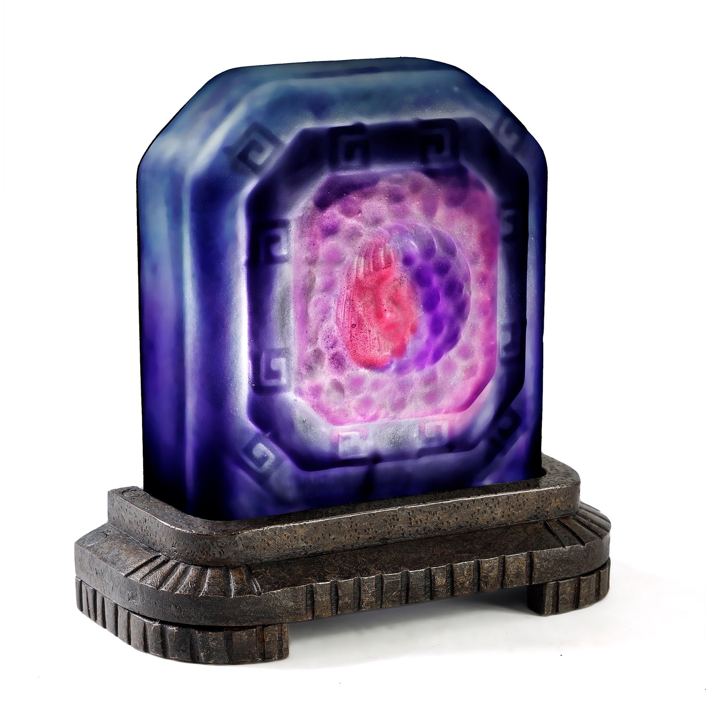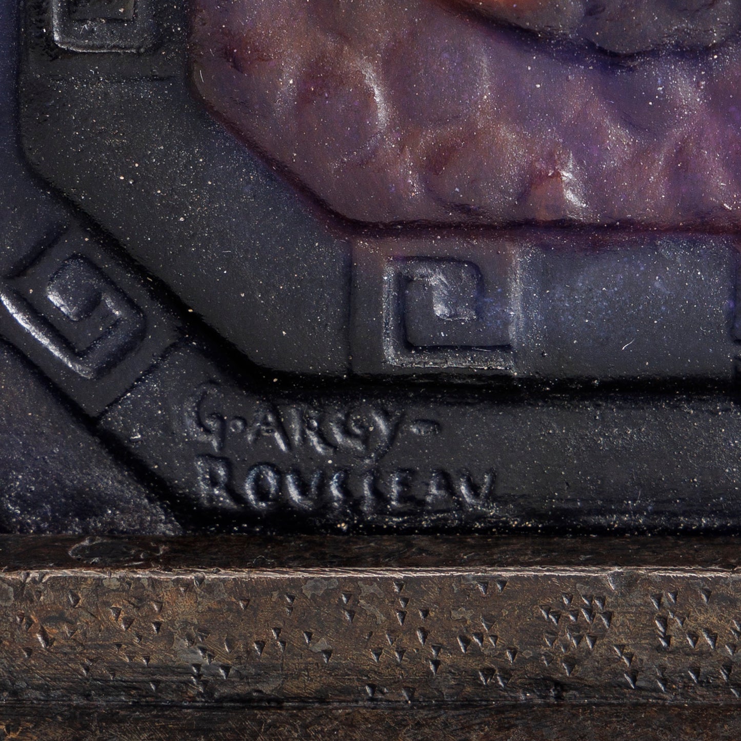 Gabriel Rousseau adopted the suffix 'Argy' in honor of his wife Marianne Argyriadès. She was his best friend's sister. They all shared a love of Greco-Roman and Egyptian antiquity. Argy-Rousseau was interested in many things, studied at the École de Sèvres, but also completed an engineering degree. Throughout his life, he conducted research in areas as diverse as dental porcelain and color photography. In his private life he always surrounded himself with creative personalities, including Henri Cros, who had long been known for his glass works using the 'pâte-de-verre' technique. Argy-Rousseau began to work successfully with the material even before the First World War, after the war he founded a glass factory that had 20 employees at its peak. He developed his own technique for producing his ideas: Argy-Rousseau first modeled his sketched idea in plaster, which was then covered with wax. A refractory hollow mold consisting of several parts was then molded from this model in several work steps. He even produced his own glass. It was crushed into powder and colored by the addition of metal oxides. With the help of fine brushes, the now liquid glass mass, which had been washed several times, was applied precisely to the walls of the refractory mould. Two more layers followed, one after the other, to create strength and at the same time prevent air bubbles from forming. The last layer was resin to further fix the pate de verre. The model was then placed upside down in a wood-fired oven, where the piece was then fired at high temperatures. After cooling, the mold was removed, the now solid object cleaned with acid and the last bumps polished off with a wheel. This is how these wonderful, transparent, at the same time colorful, delicate-looking objects came into being.