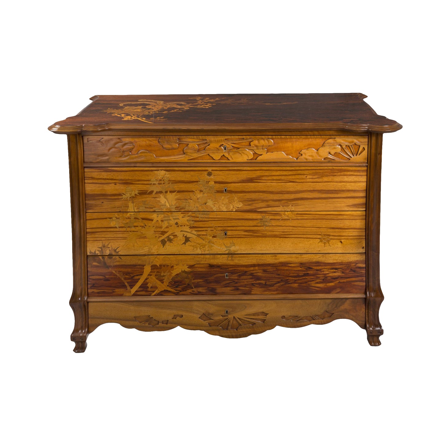 Émile Gallé is largely considered to be one of the driving forces behind the entirety of the Art Nouveau movement in France and abroad. His designs, combined with innovative techniques, made him one of the pioneering glass makers of his generation. His glassmaking and artistic style was influential to other top Art Nouveau artists of the time, with pieces that revolutionized the art of glassmaking by combining techniques such as enameling, cameo, inlay, and more. Nature was his main source of inspiration, each piece featuring the balances of the natural world, and with a genius to seize the accidental and use it. Gallé moved to open a small woodworkers shop in 1885, where he began experimenting in marquetry designs in furniture of his own. The plants that adorn his pieces are highly varied, and insects were a frequent theme, with many of his pieces containing butterflies, dragonflies, and beetles. Determined to make Art Nouveau style known worldwide, he founded the “École de Nancy” to promote the Art Nouveau style, and create a union between art and industry. His artwork lives on in almost every museum around the world.