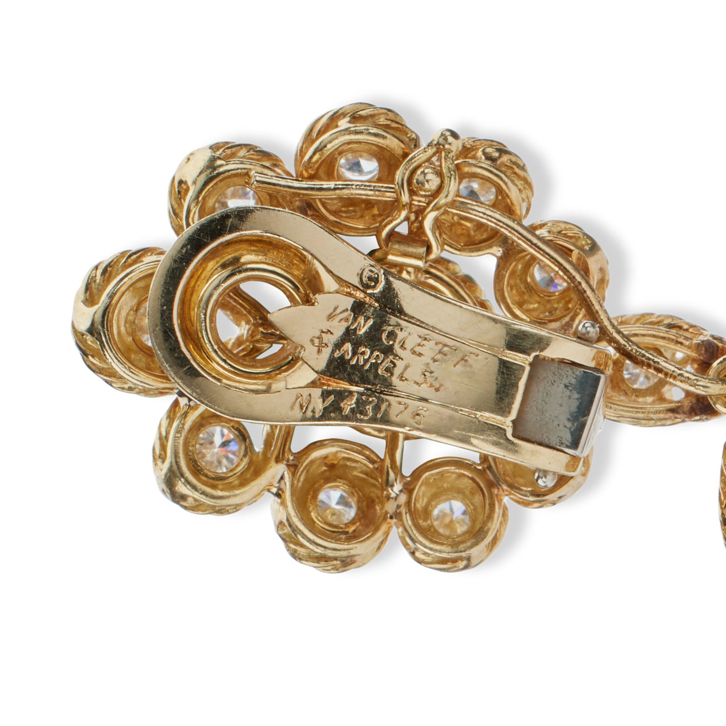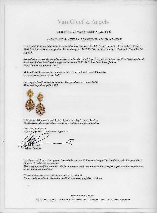 Designed in the 1960s, this convertible 18K gold and diamond suite by Van Cleef & Arpels comprises a pendant necklace and day/night earrings. The 18K gold ropework necklace with detachable pendant is designed as a single dividing to double-stranded diamond rivière, sweeping to a delicate point in the center, and suspending a detachable leaf-form pendant with a flexible fringe, set throughout with round brilliant-cut diamonds. The ensuite 18K gold ropework and diamond day/night pendant earrings are each designed as an oval top suspending flexibly-mounted detachable leaf-form pendants. Beautifully-made, softly flexible, and versatile, this opulent Van Cleef & Arpels suite derives inspiration from the forms and sacred materials of India, where precious gems, gold and spirituality have synthesized to create thousands of years of jewelry art.