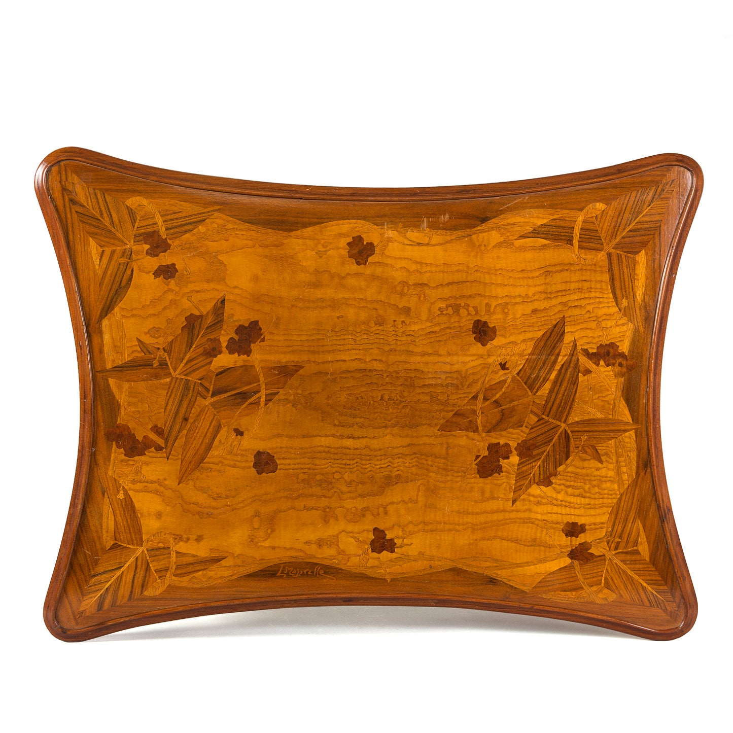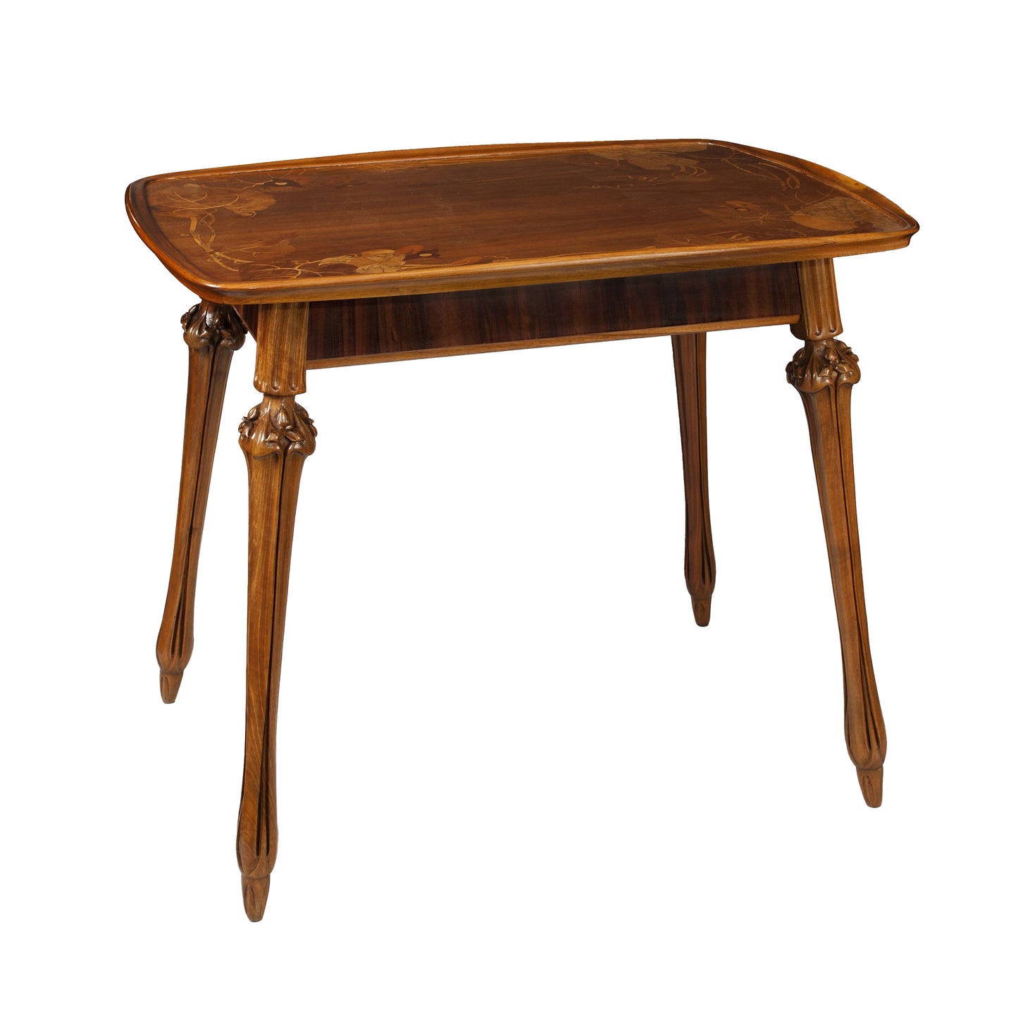 Firmly rooted in the craft of woodwork and furniture-making, Louis Majorelle’s furniture subtly recalls the splendors of furniture from the 1700s. Majorelle often ornamented his pieces with gracefully sculpted gilt mounts, while the sinuous natural forms which inspired him suggested the C-scrolls of the Louis XV era. Using a new vocabulary of natural forms and the sumptuous lines of Art Nouveau, Majorelle's furniture merged old and new in a tantalizing way. This combination of exceptional craftsmanship with the new aesthetic was celebrated by the public and critics alike, who saw in Majorelle a cherished link between the grandeur of the eighteenth century and the promise of the modern age. The influence of Émile Gallé inspired him to take his production in new directions in the 1890s, when Majorelle's furniture began to reflect the Art Nouveau designs created by his contemporaries. He continued to experiment with Art Nouveau motifs that were gaining popularity and began working with floral decoration in marquetry, but overall, his furniture still betrayed a Victorian sensibility, though of the highest quality, and in a wide range of wood veneers.