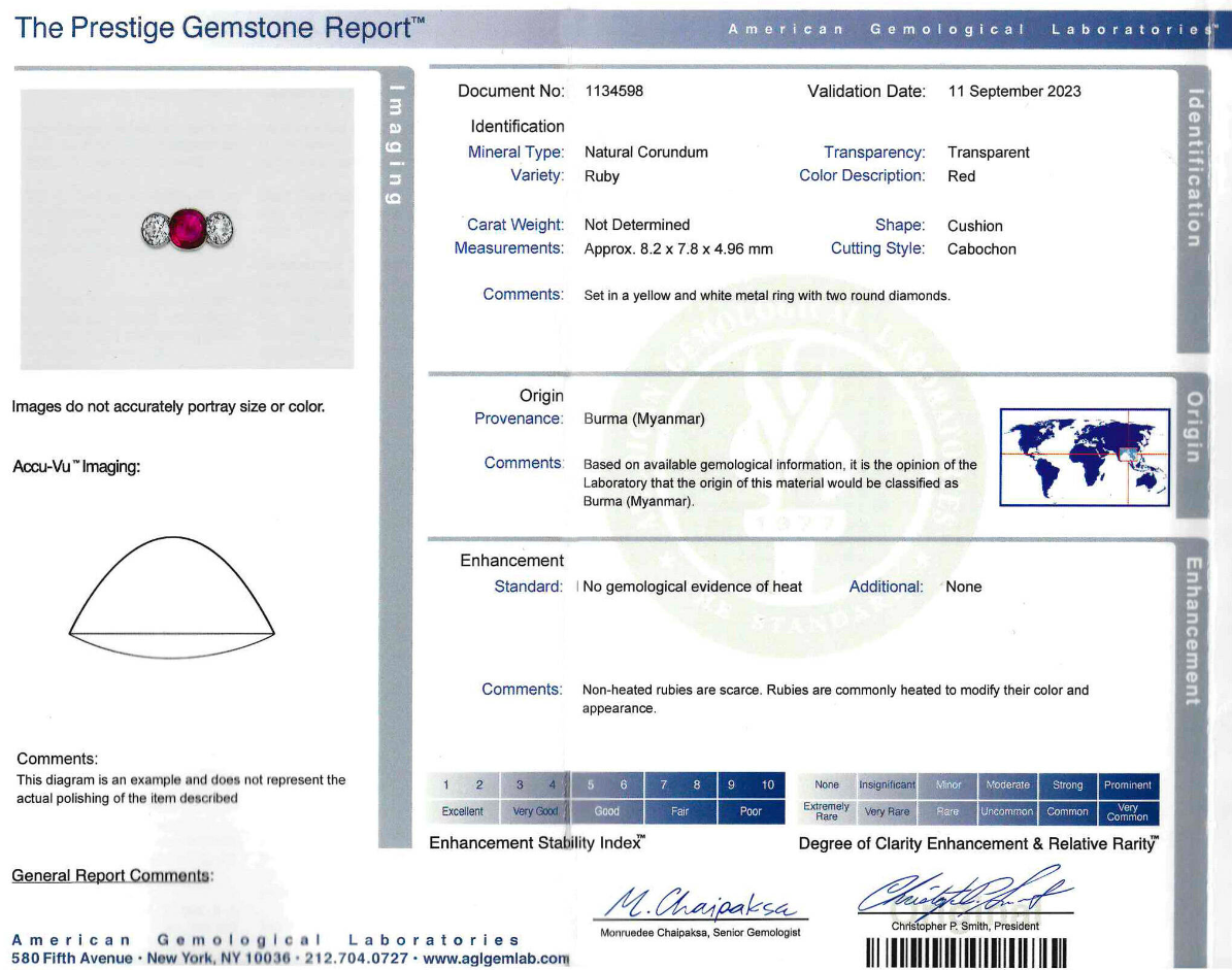 Materials: 1 sugarloaf cabochon ruby (approximate total weight 3.30 carats); 2 old European-cut diamonds (weighing approximately 1.01 and 1.12 carats, color and clarity I/J and VS/SI); platinum topped 18k gold