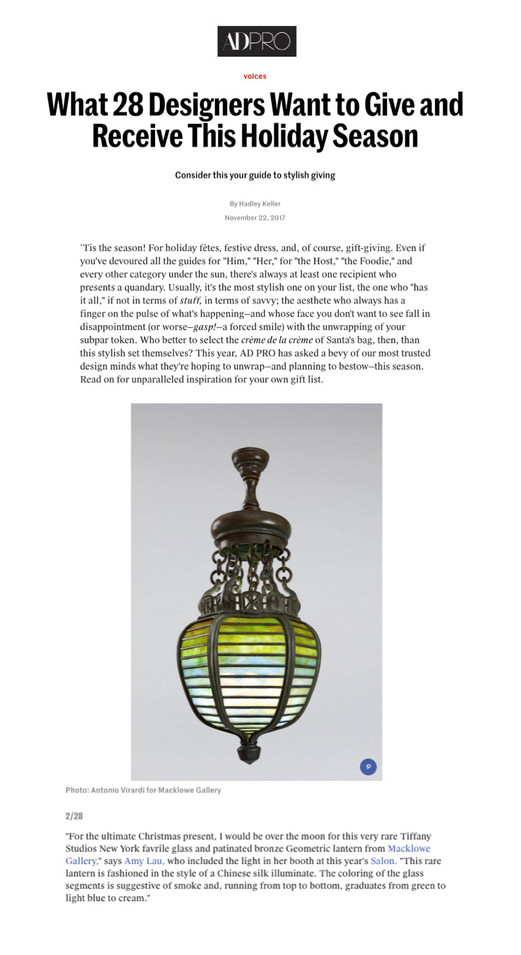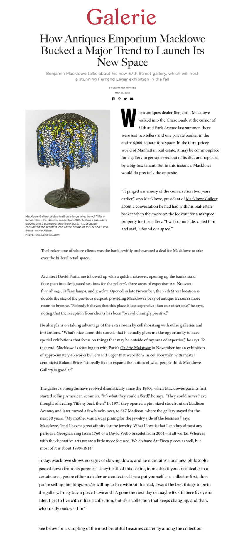 Macklowe Gallery is the world's premier dealer of museum-quality 20th century decorative arts, and the largest global home of authenticated Tiffany Lamps. For nearly 50 years, we have been sought by scholars, museum curators and collectors for our specialty in French Art Nouveau furniture and objects, Tiffany Lamps and Tiffany glass, and fine jewelry. Our gallery ensures the authenticity of all of our pieces, which are thoughtfully selected for their artistic value, rarity and historic importance. With more than 6,000 square feet of gallery floor space directly on Park Avenue, we are able to display one of the most important and comprehensive collections in the world.