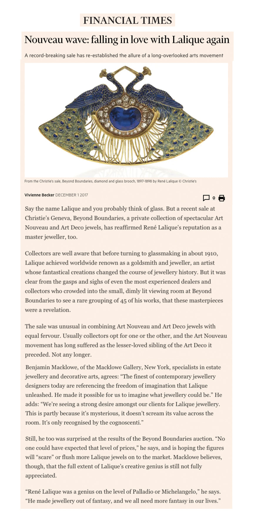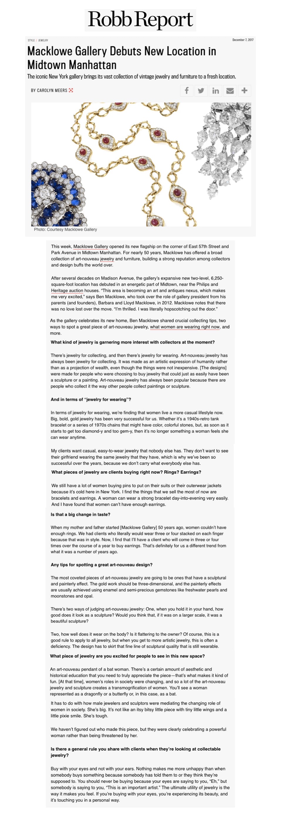 Now under the leadership of Benjamin Macklowe, Macklowe Gallery has re-dedicated itself to educating and promoting the next generation of innovative collectors. Ben Macklowe has been recognized in the industry as a thought leader and lectures regularly at Christie's, Sotheby's and Appraisal Industry events. Together with the gallery's team of curatorial experts, Ben and Hillary have authored books on Art Nouveau sculpture and jewelry that have become standards in the field.