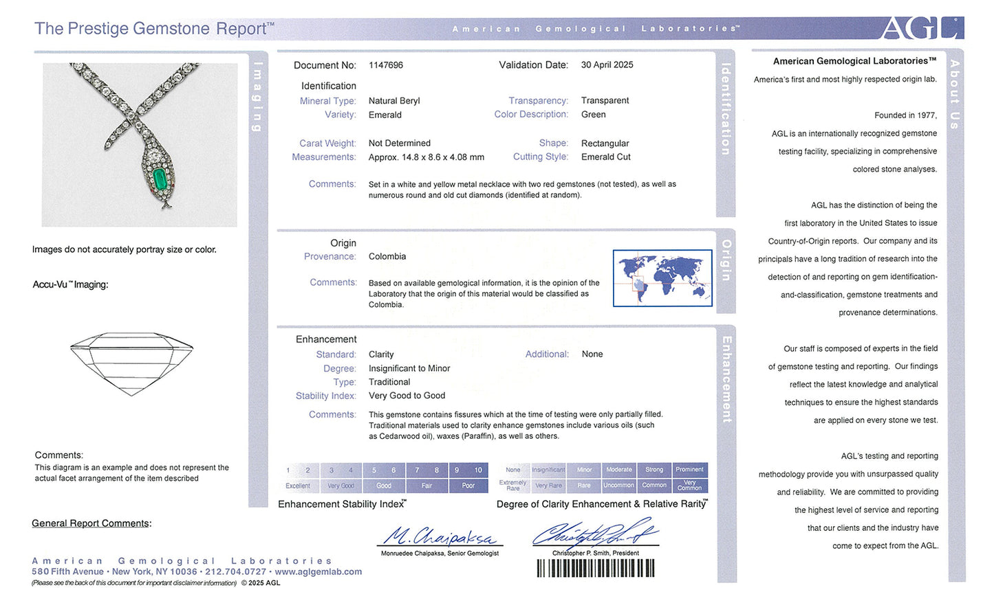 Documentation: Accompanied by certificate #1147696 from the American Gemological Laboratory (AGL) stating that the emerald is of Colombian origin, with insignificant to minor oil treatment.
